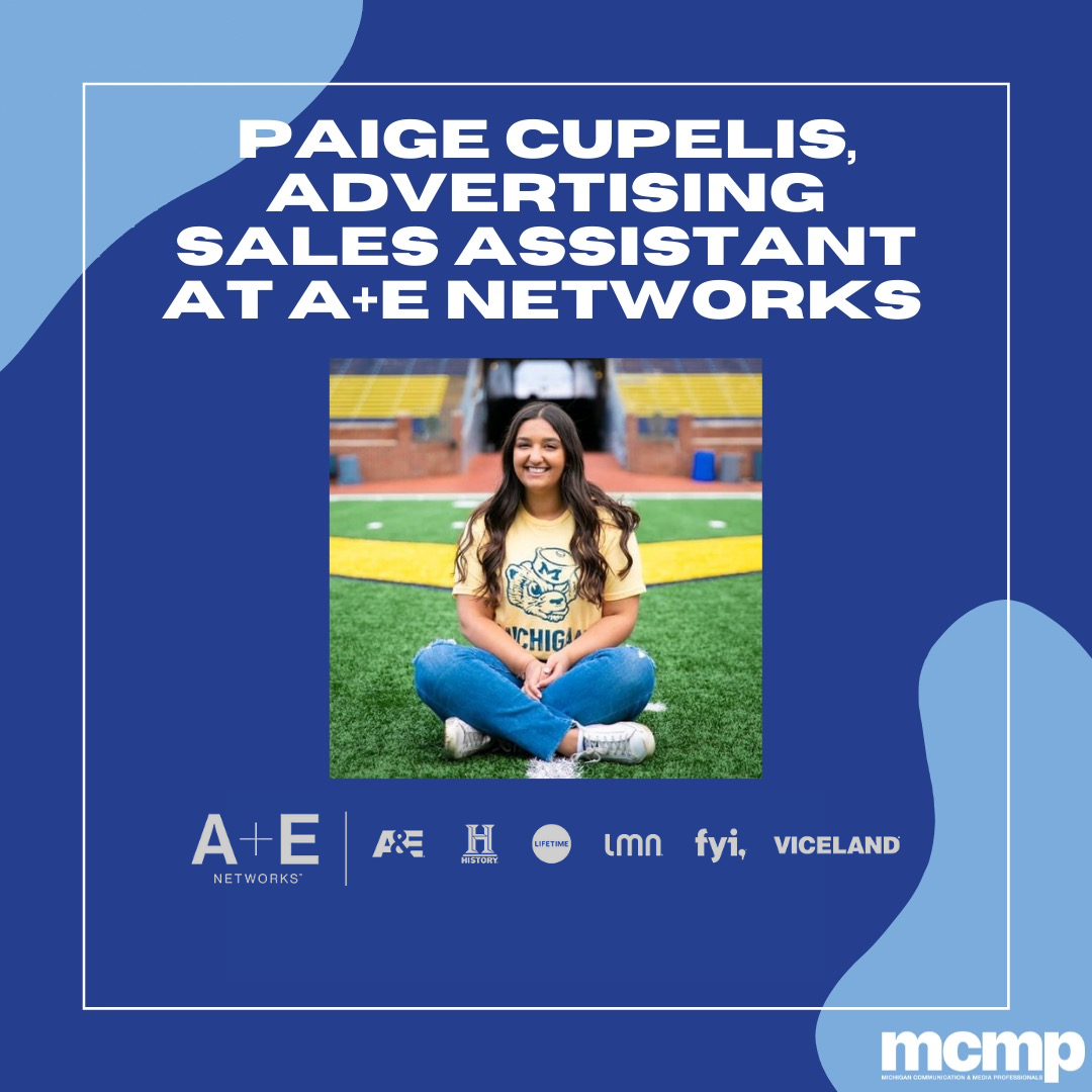 On Tuesday, October 12th, MCMP was joined by A+E Advertising Sales Assistant, Paige Cupelis. Before graduating from Michigan in 2019 with a degree in Communications, Paige held several internships which helped pave her career path. She recognized that many college students feel pressure to have multiple internships at large corporations, which can be a significant source of stress. Paige shared that transferable skills she gained from her time as a camp counselor, as well as her internships at ORT America and MO Marketing & PR, have really helped guide her through her professional career. Interning at a smaller boutique firm allowed Paige the opportunity to explore both the PR and marketing sides of the company. Though she was originally leaning toward pursuing a career in PR, her experience at MO brought Paige to the realization that she preferred marketing.